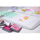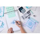 To use the this tool, begin by placing your chosen stencilling surface on top of the sticky grid sheet on the base of the tool to keep it in position.Then attach the mint-coloured stencil adapter to the desired position and securely attach your chosen stencil to the pegs on the adapter using the holes included. Next, simply apply your chosen medium and once finished with your stencil, unclip and change it to the next corresponding one and continue building up layers to reveal an amazing design. As if stenciling wasn't enough, this unique tool also adaptsinto a stamping press giving you free reign to add even more to your makes!
